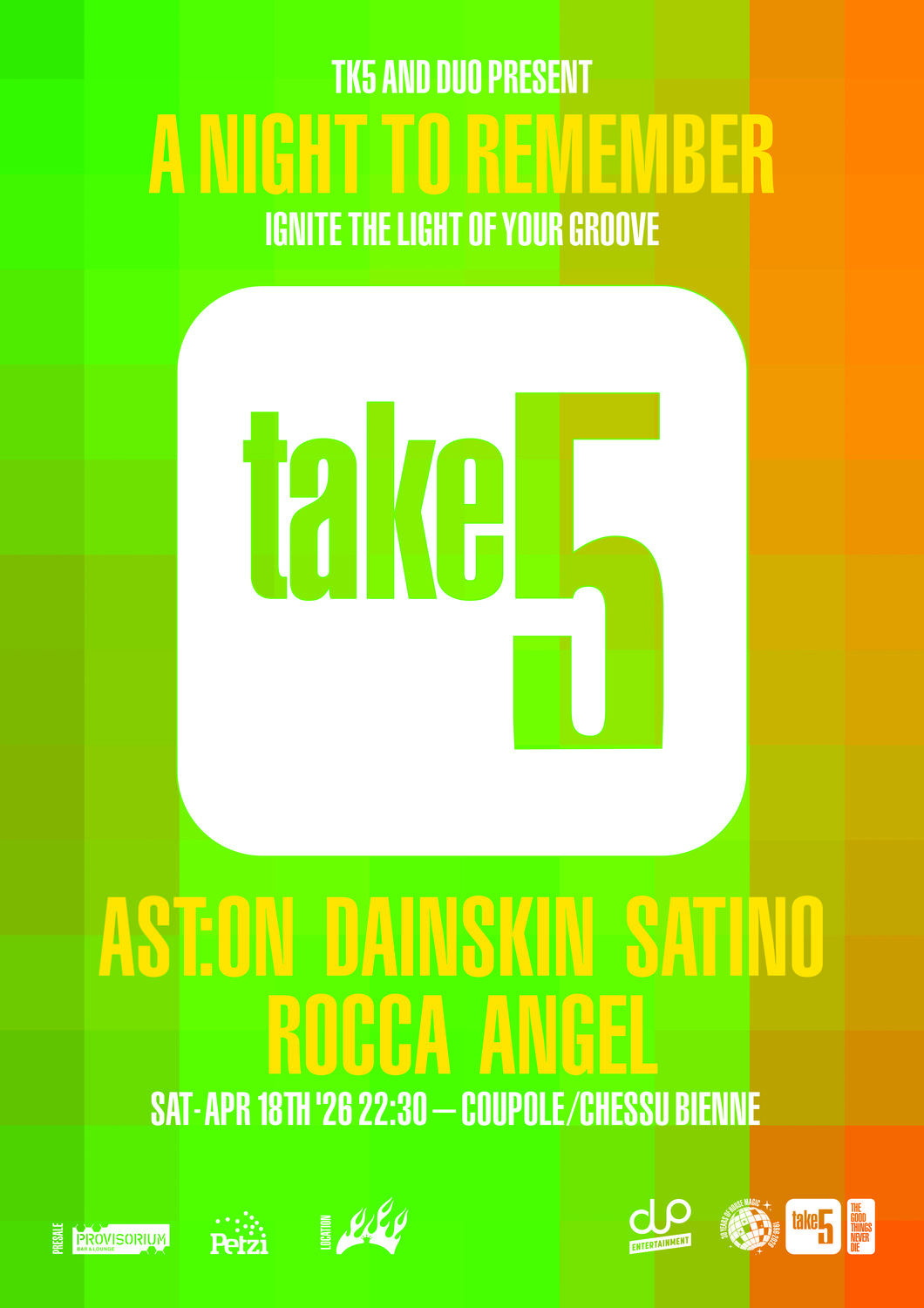 The legendary Take5 Crew will be back! LINE UP As:ton Dainskin Satino Angel Rocca Cocktail Bar by Provisorium